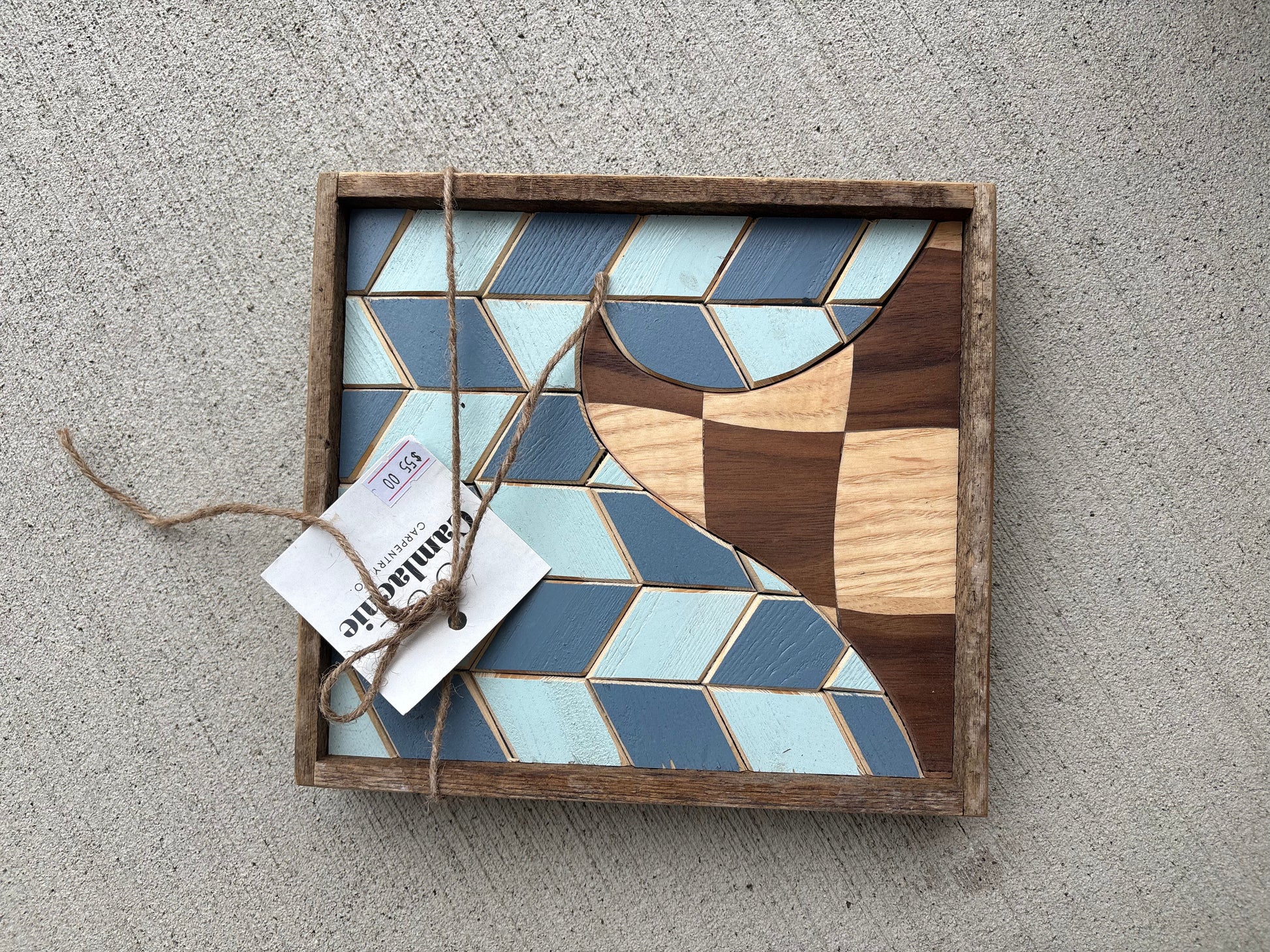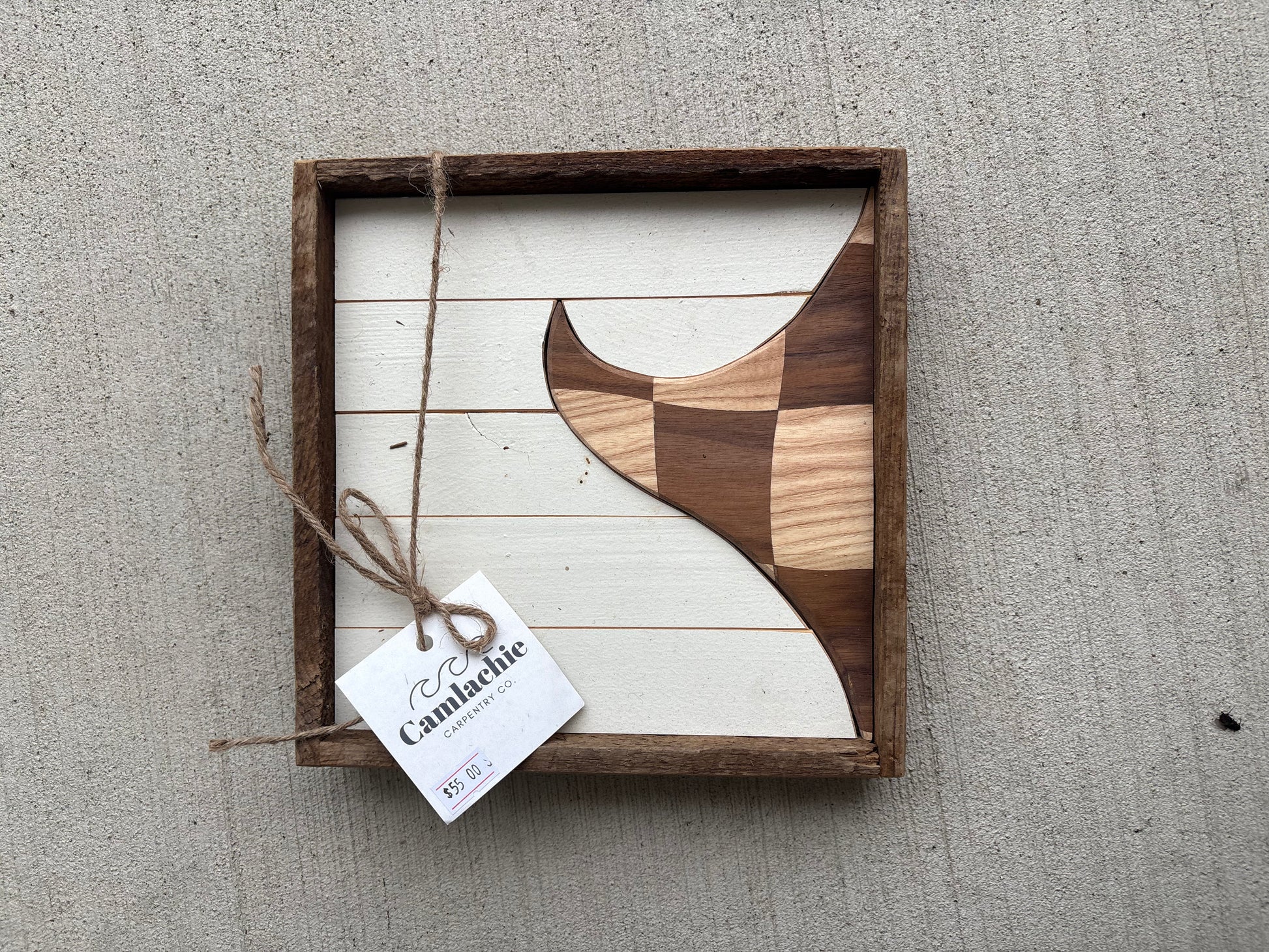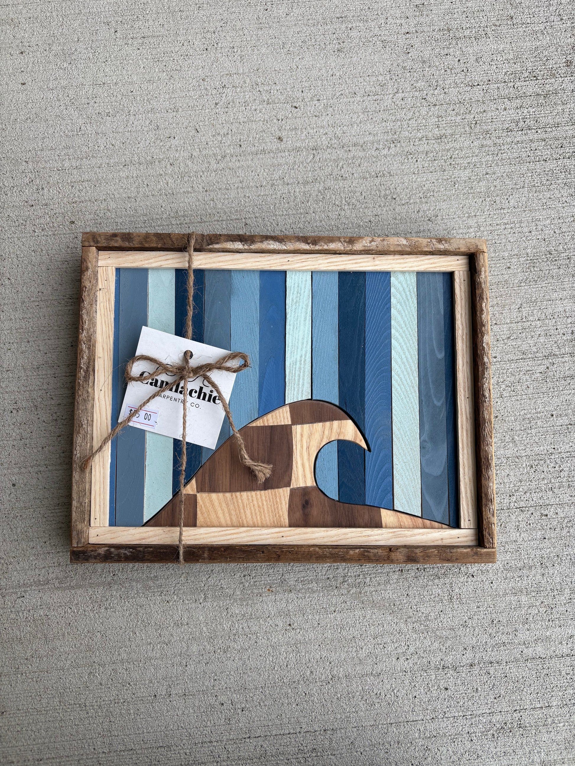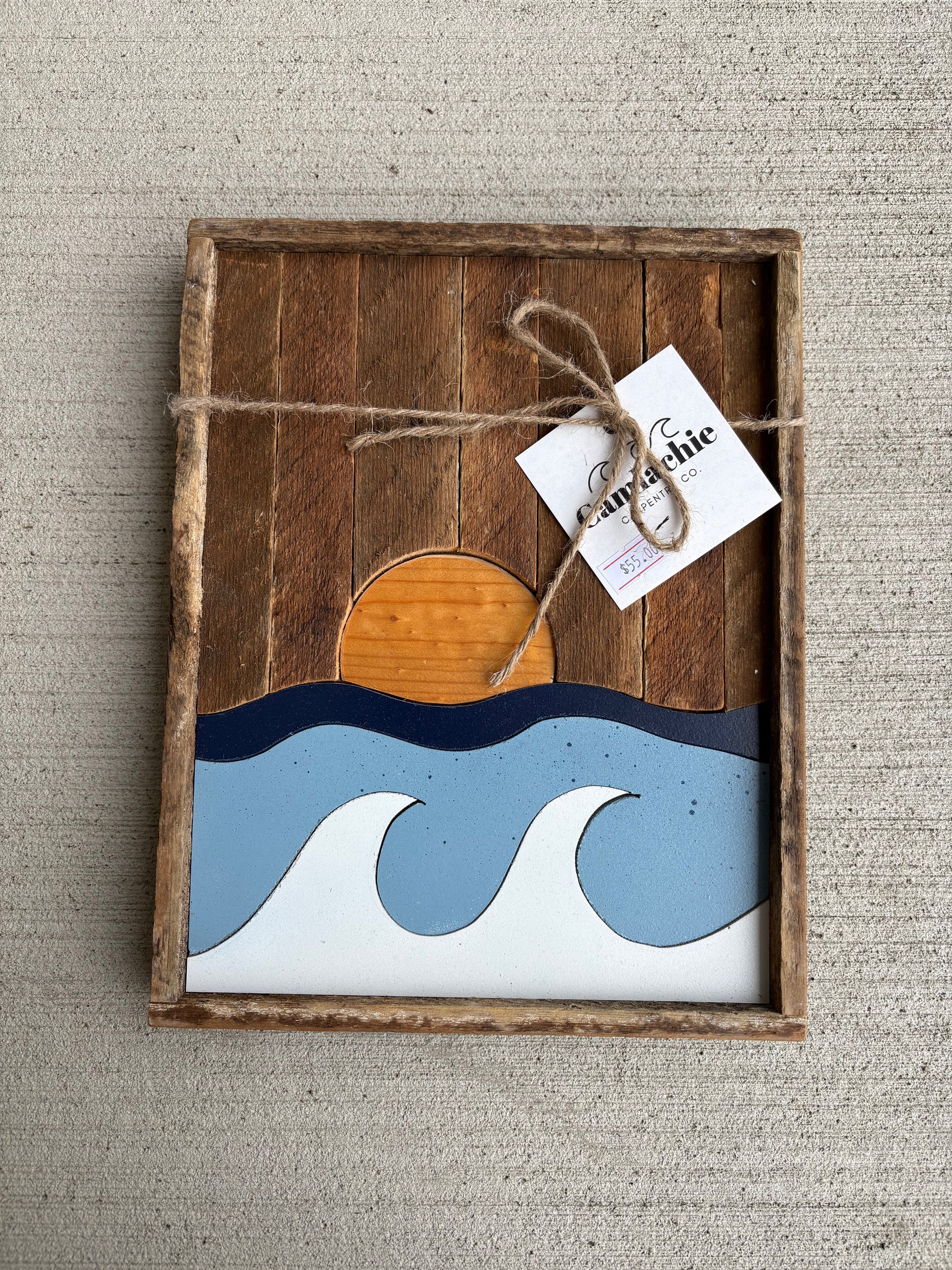 One of a kind Mini wave & sunset plaque with sawtooth hanger. Made by hand from upcycled lath each piece measures approximately 8.5x11”